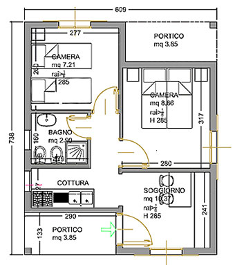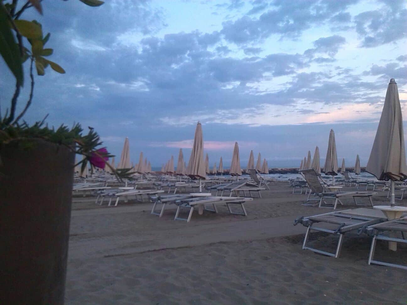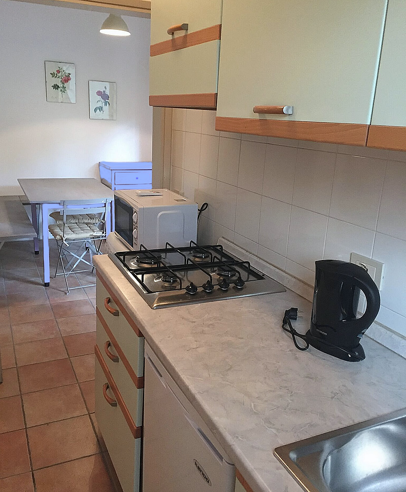 Decorated in taupe tones and purple light blue, the bungalow is located overlooking Via della Pineta, which is divided by a hedge. Together with the bungalow 2, 3, 4 and 5 is the most direct access to the sea.The bungalow is 80 meters far from the beach and it is composed by a patio/terrace with table and chairs, living room with table, 2 chairs and two benches, a bathroom with shower and bidet, 2 bedrooms that can hold up to 4 or 5 beds. The kitchen is equipped with washing machine, refrigerator and microwave, complete with everything needed for cooking: pots, plates, cutlery, utensils and tea towels.